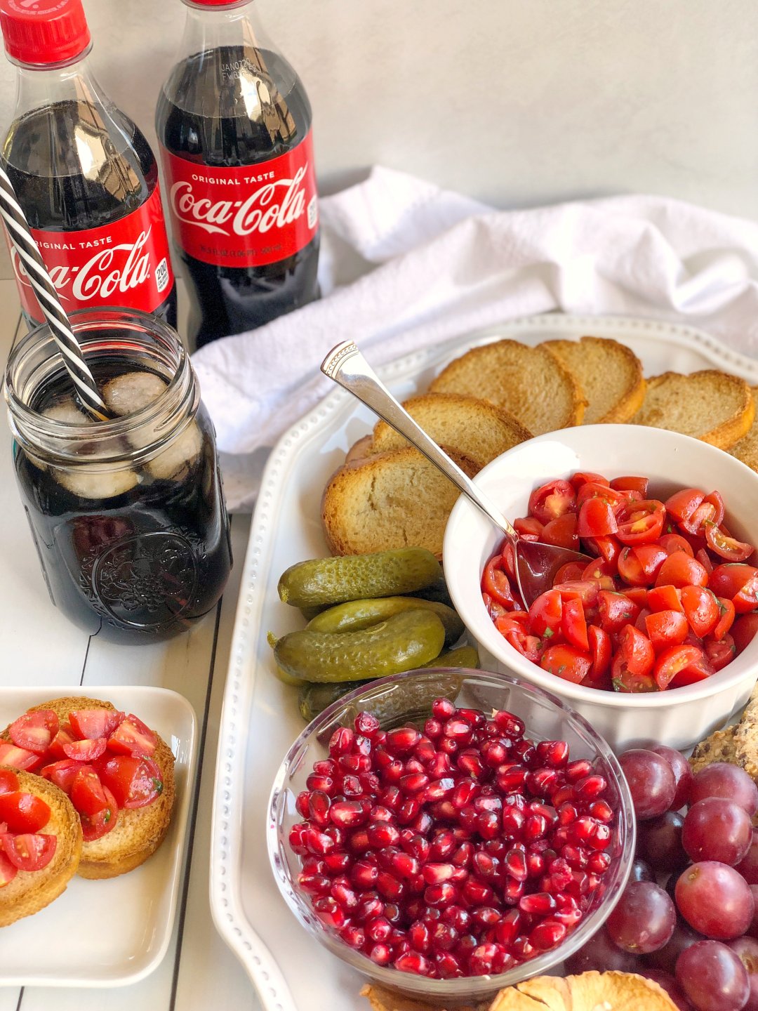The key to putting together an ultimate winter bruschetta bar is to have various flavors and textures! That's why I chose juicy grapes, festive pomegranate seeds, crunchy dried fruit, briny pickles, salty nuts, and savory crackers. All of these ingredients compliment the bruschetta and pair perfectly with a crisp classic glass of Coca-Cola®.