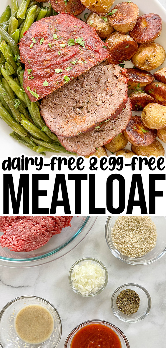 Once cooked, let meatloaf sit for 10 minutes before slicing and serving. This gives the juices time to redistribute and settle. I suggest serving with a side of mashed potatoes, roasted baby potatoes, green beans, or dairy free and egg free dinner rolls.