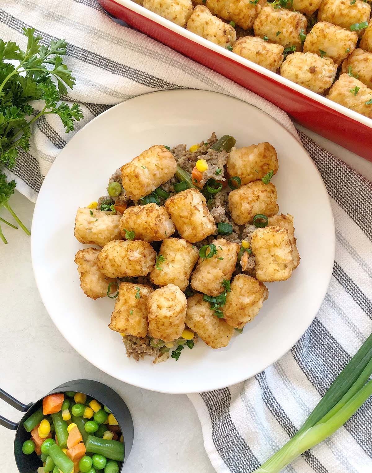 – 1 pound ground beef – ½ yellow onion, diced – 1 tbsp flour – ¼ cup broth – ¼ cup dairy-free milk – ½ cup mixed vegetables – 2 cups frozen tater tots