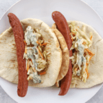 My Copycat Star Wars Galaxy’s Edge Ronto Wrap recipe comes together with grilled sausage, tangy slaw, and homemade cucumber-peppercorn yogurt sauce. Dairy-free and gluten-free!