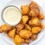 This vegan buffalo wings recipe is quick and easy to make in the air fryer. They're crisp on the outside and tender on the inside. Simply toss battered cauliflower in homemade buffalo sauce for a delicious dairy free snack.